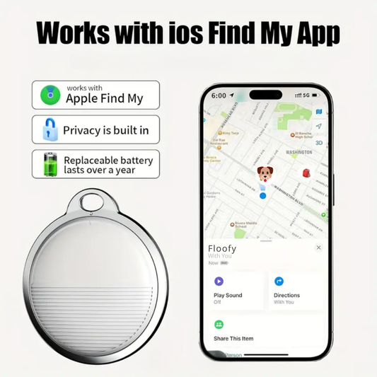 Our smart GPS tracker easily connects to Find My on iOS devices, working just like an Apple AirTag. You’ll have access to the real-time location of the tracker directly in the app. Simply press the ring button, and the tracker will start ringing, making it easy to locate. Additionally, you'll receive directional guidance to the device and notifications if it goes out of range, giving you peace of mind and ensuring your pet’s safety at all times.